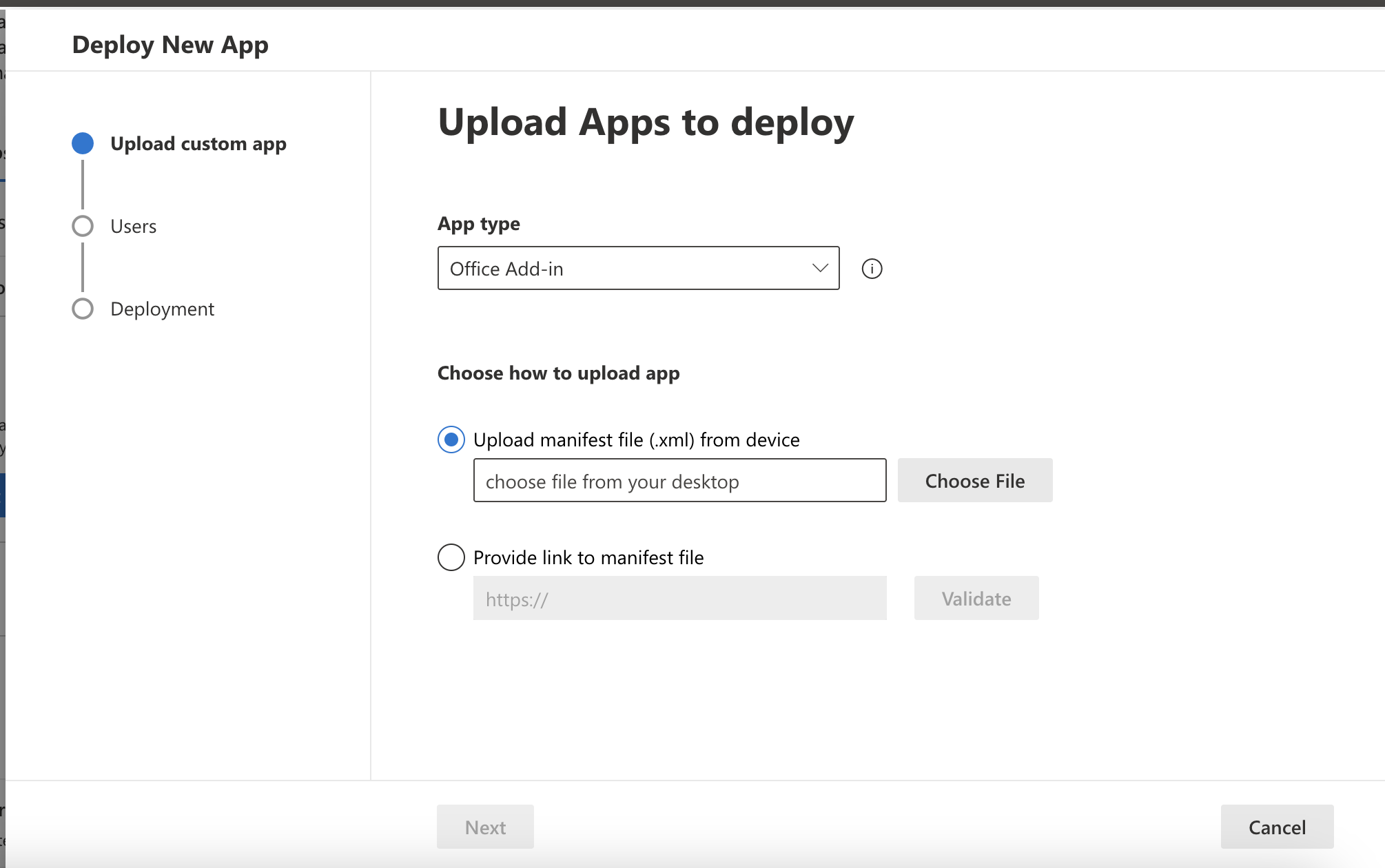 Download this XML file, click on Upload custom apps and follow the instructions to install the application as an Office Add-in.