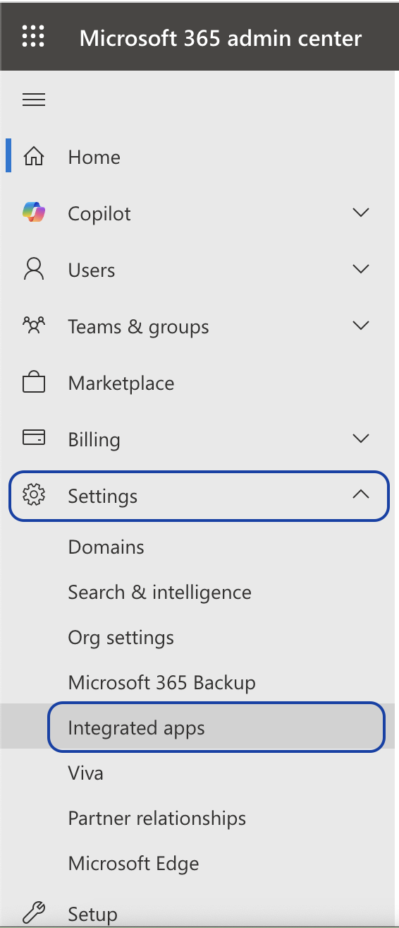 Log in to your Admin Center account and look in the left sidebar for the Settings > Integrated Applications tab.