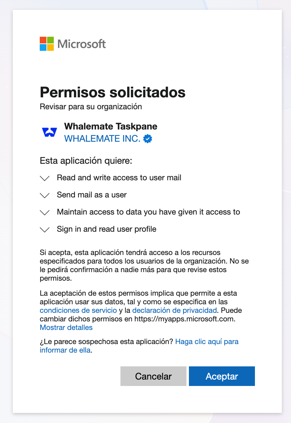 You will be redirected to a Microsoft permission consent screen. Review and accept the requested permissions to authorize Whalemate.